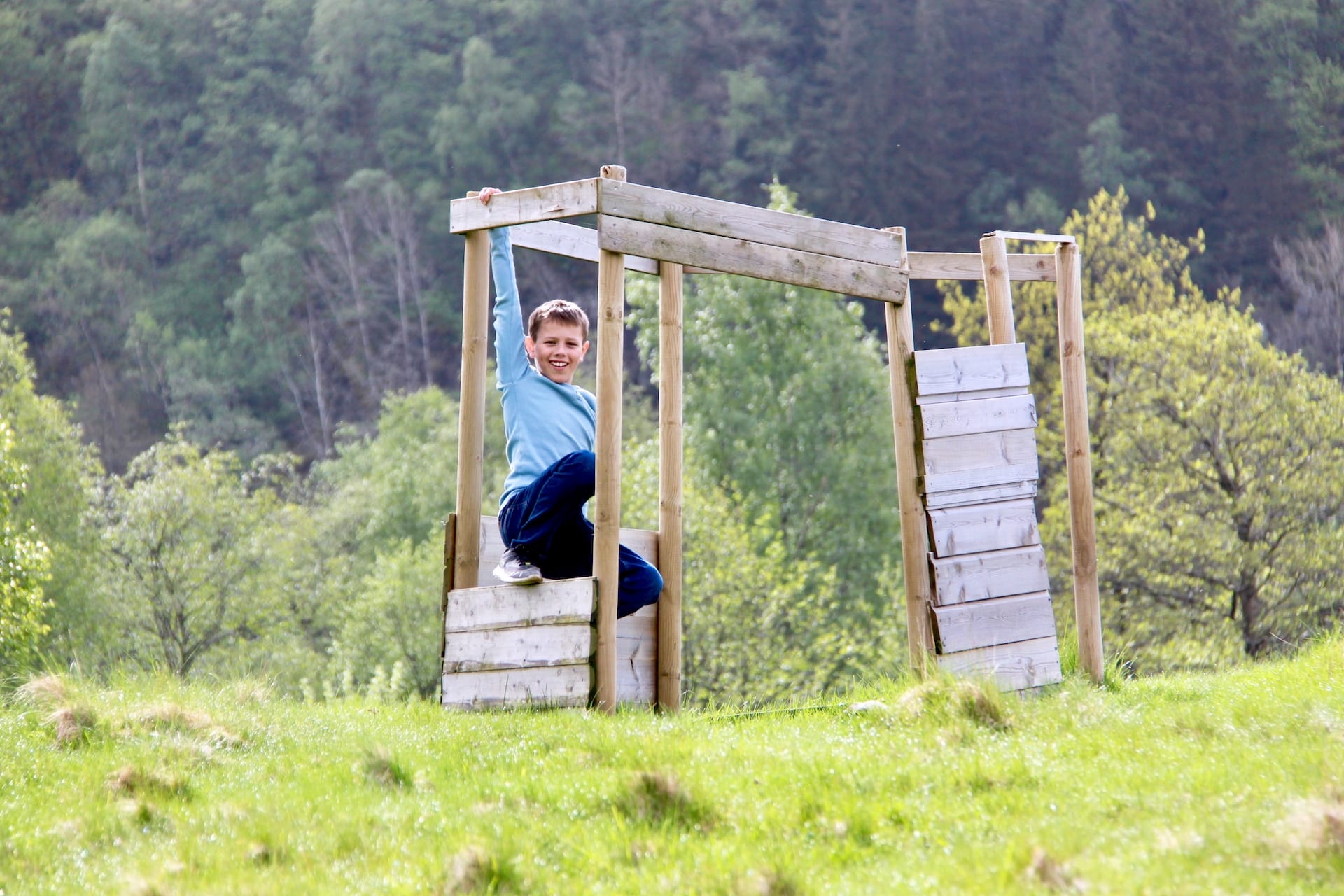 CAMPINGPLASS: På haugen opp frå huset deira, har Ola og søstrene funne ein passande teltplass med utsikt ut mot Årdalsfjorden. Der har dei òg snikra saman ei primitiv campinghytte. (Foto: Morten Hetland)