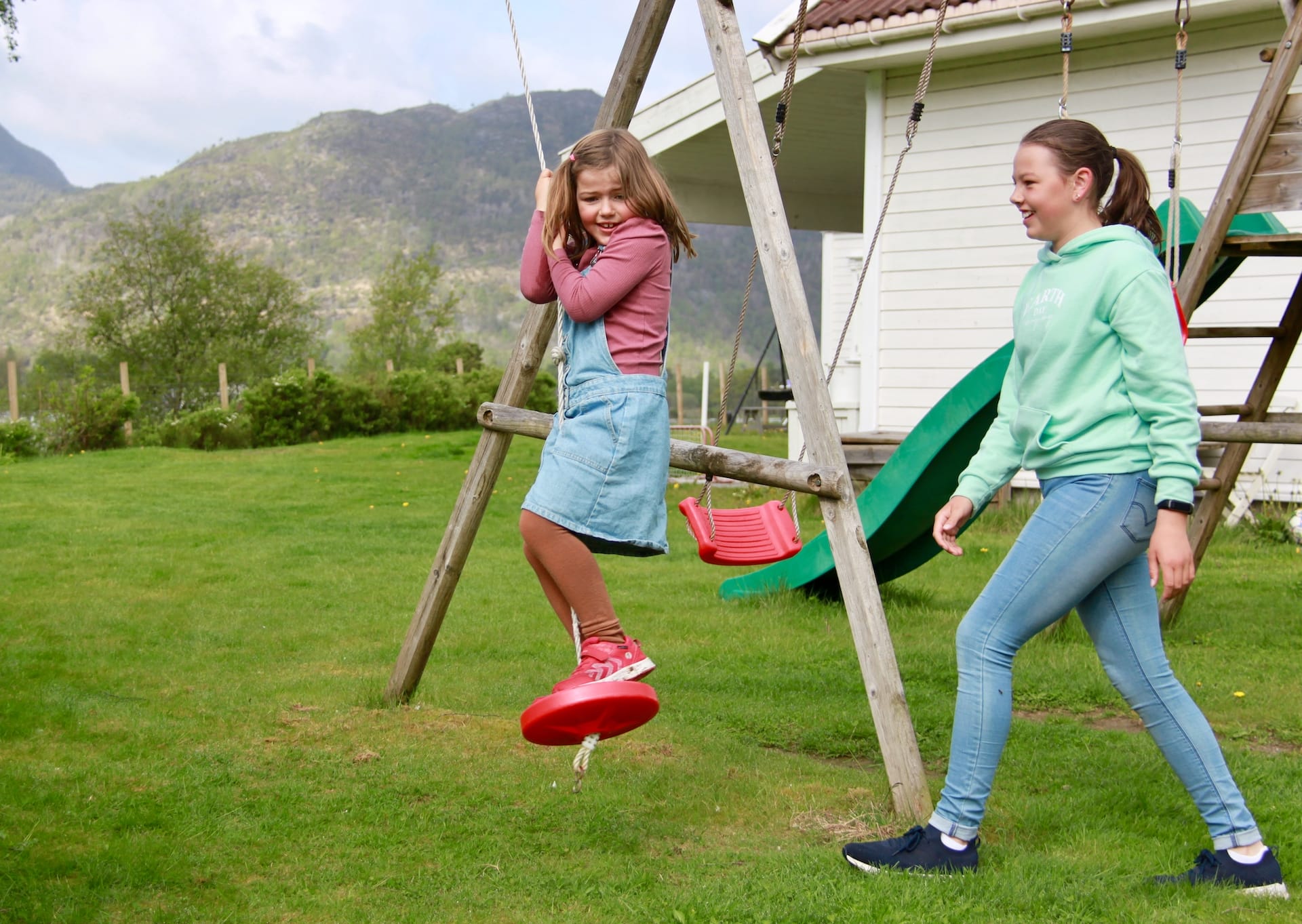 YNGST OG ELDST: Emma og Ida er yngst og eldst i søskenflokken. Heime i hagen på Sedberg er det flust med boltreplass for både store og små ungar. (Foto: Morten Hetland)