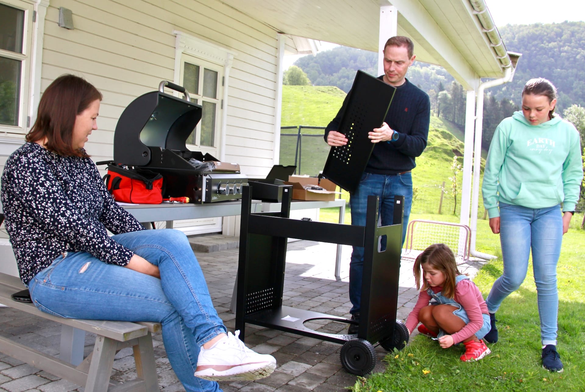 LOKALHANDEL: Anders er opptatt av å handla lokalt. Denne nye gassgrillen har han kjøpt på BondeKompaniet Årdal, og i dag passar det godt å skru saman dei siste delane, før familien skal grilla lokalprodusert grillribbe. (Foto: Morten Hetland)
