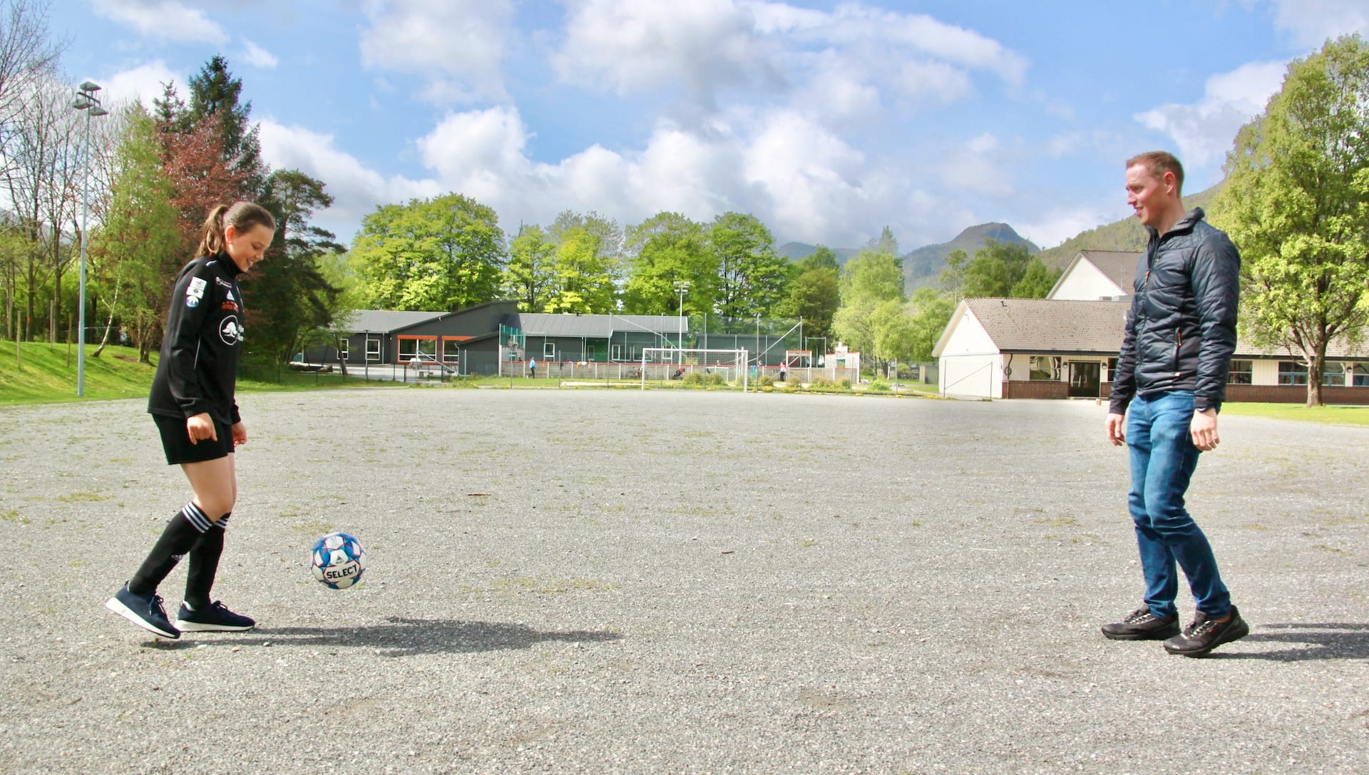 VENTAR PÅ KUNSTGRAS: Ida og Anders gler seg til det blir lagt kunstgras på grusbanen ved Årdal skule og Årdal barnehage. Hjelmeland kommune har løyvd ca. 1,6 millionar kroner til oppgradering av fotballbanen i Årdal i 2022. (Foto: Morten Hetland)