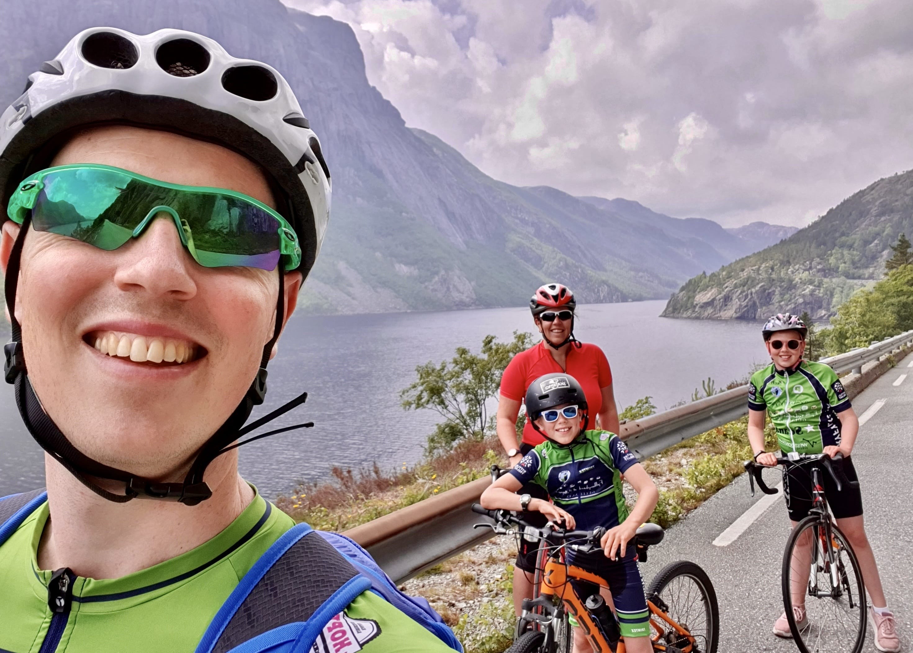 GRØNT ER SKJØNT: Anders koplar gjerne av med ein sykkeltur, kledd i Ryfylke Sykkelklubb sin knallgrøne sykkeldrakt. Her er han på sykkeltur ved Tysdalsstranda, saman med Ruth-Iren, Ola og Ida. (Foto: Anders Sie)