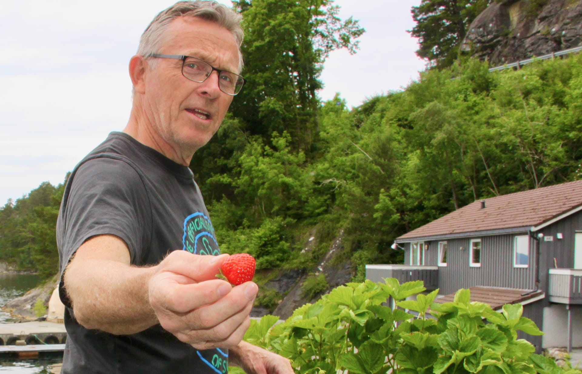FRISKT: Tidlegare var det produksjon av grønnsaker på småbruket Hetlevik. Nå hentar Reidar berre friske jordbær, til eige forbruk, rett frå terrassen. I bakgrunnen står den tidlegare driftsbygningen, som nå husar ferieleilegheitene til Hetlevik Maritim. (Foto: Morten Hetland)