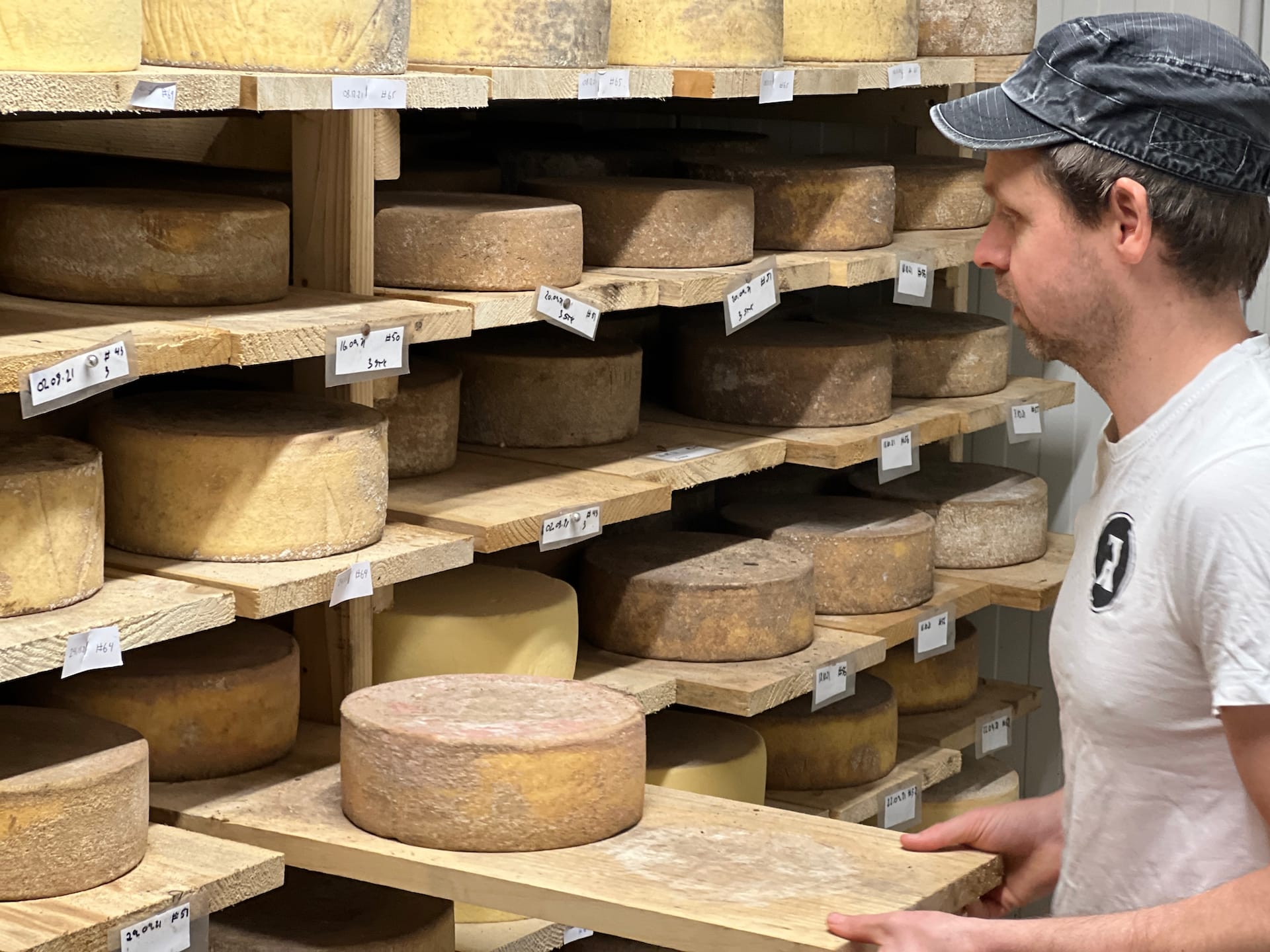 PØYG: Lageret til Ryfylke Gardsysteri er sprengfullt med ostehjul, nærare bestemt 1,3 tonn med Rabben Pøyg. (Foto: Morten Hetland)