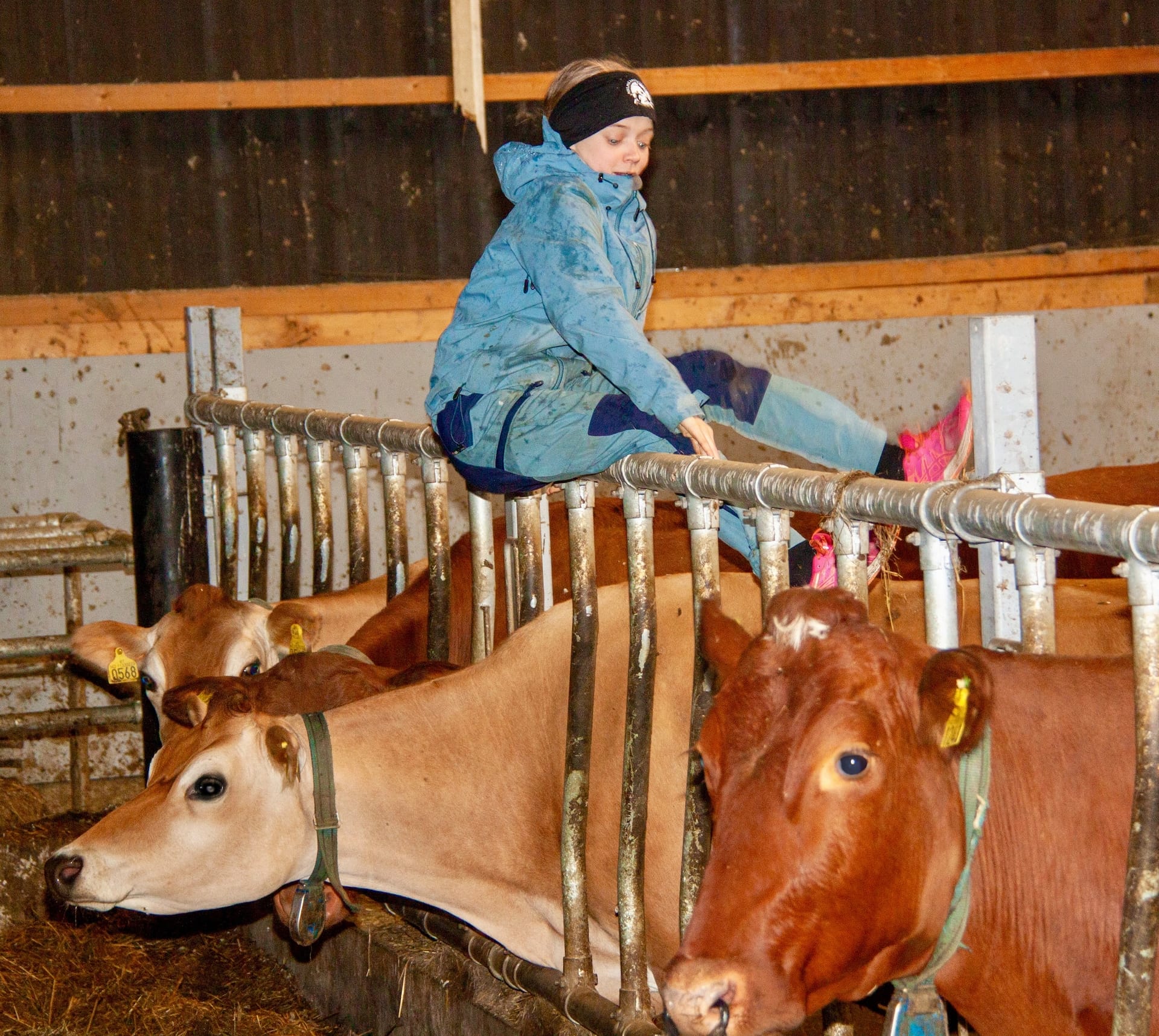 SVINGAR SEG: Frida bruker gjerne innreiinga i kufjøset som turnstativ, men ho gler seg aller mest til å leika med kalvane ute på beitet seinare i år. (Foto: Morten Hetland)