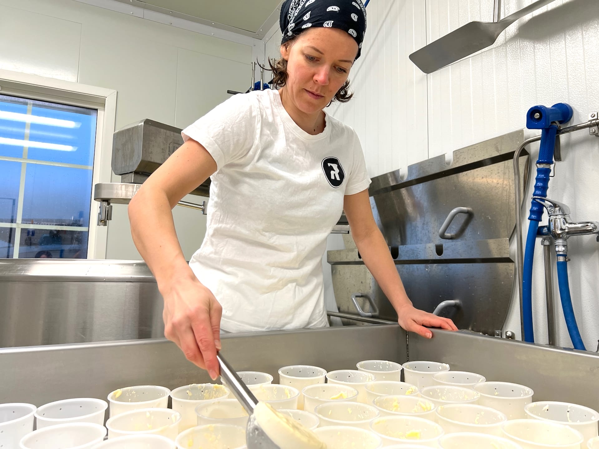 MEDHJELPAR: Hilde hjelper ivrig til med alt som må gjerast på garden. I dag fyller ho plastformene med den nye Ryfylkeosten. (Foto: Morten Hetland)